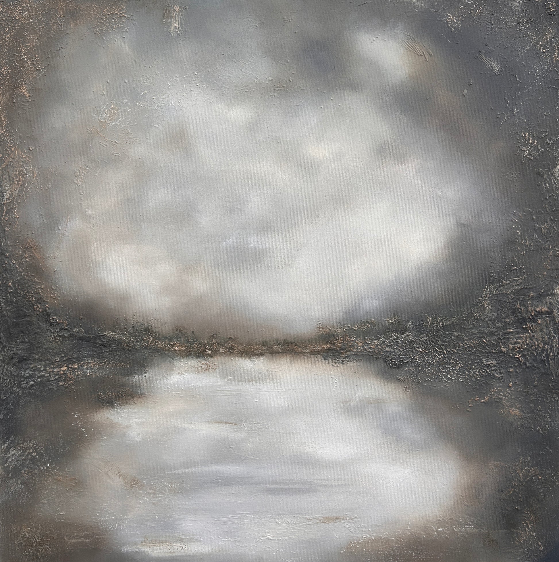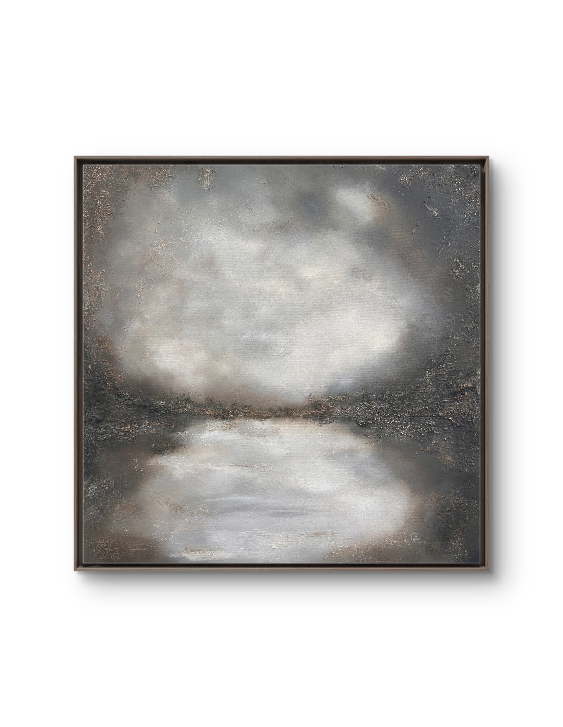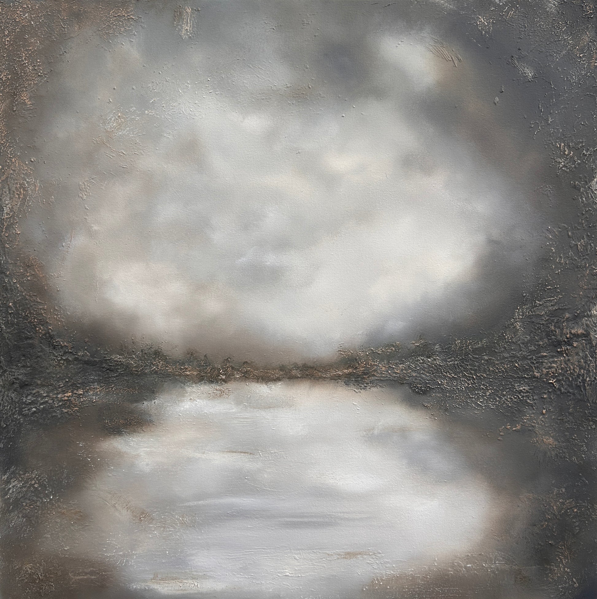 Hints of earth and metallic warmth break through the umber feel, giving the artwork a grounded, atmospheric presence - weathered, luminous in places, and entirely contemplative.